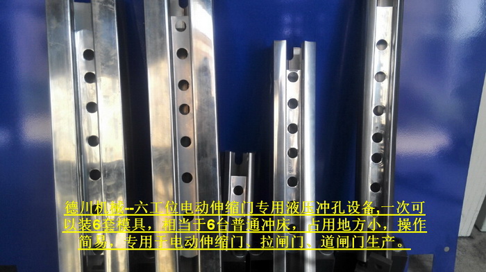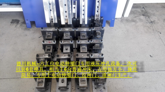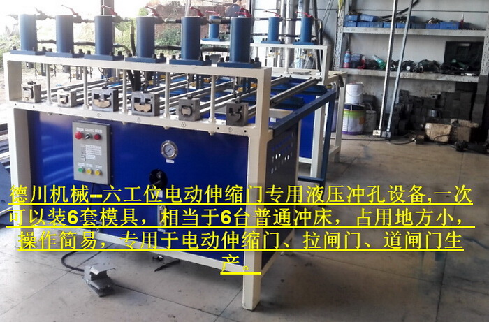 六工位電動(dòng)伸縮門專用液壓沖孔設(shè)備,一次可以裝6套模具,相當(dāng)于6臺(tái)普通沖床,占用地方小,操作簡易,專用于電動(dòng)伸縮門、拉閘門、道閘門生產(chǎn)。...