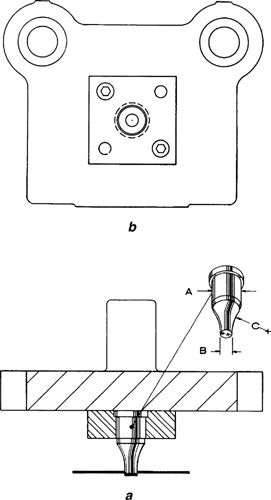 主體直徑a遠(yuǎn)大于沖裁直徑B;半徑C提供支撐材料,以提供剛性,并防止沖頭在接觸材料帶時(shí)發(fā)生偏轉(zhuǎn)。剖面圖a顯示了沖頭、沖頭板和沖頭支架,它們將出現(xiàn)在整個(gè)模具圖紙的左下剖面圖中。
