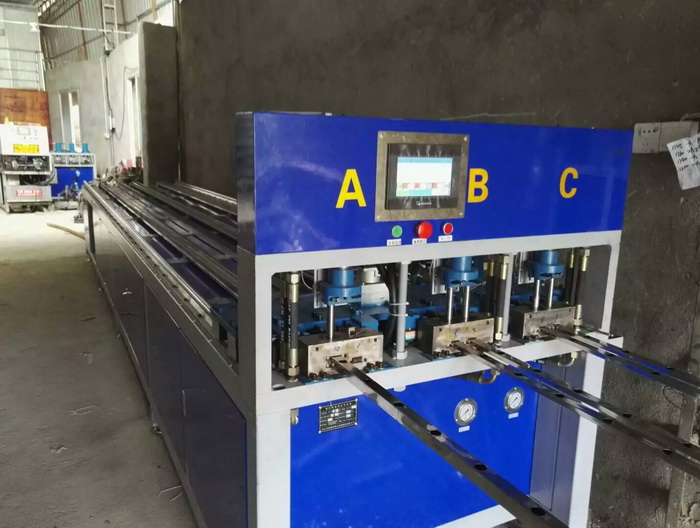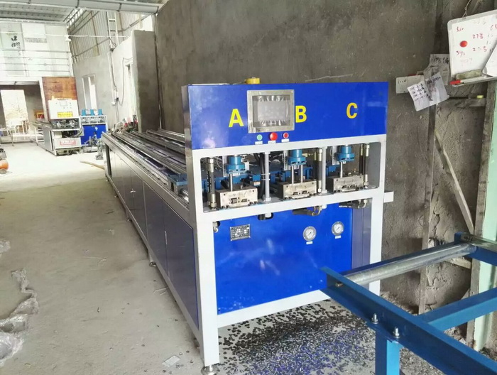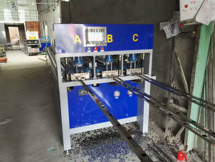 三工位數(shù)控全自動(dòng)沖孔機(jī),漳州用戶使用現(xiàn)場,最多一次沖6支管,每個(gè)油缸可獨(dú)立控制全孔或半孔,一次完成一個(gè)防盜窗沖孔加工,效率更高。
